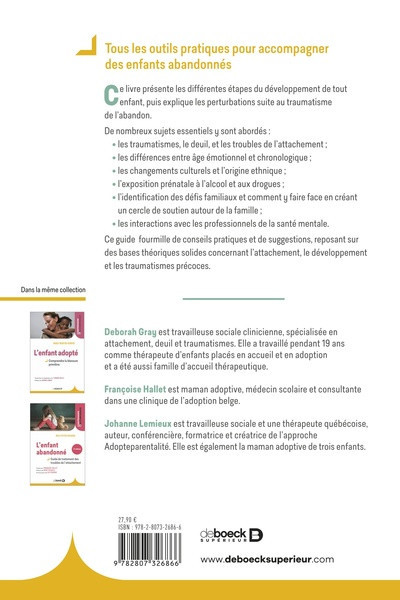 Ce livre présente les différentes étapes du développement de tout enfant, puis explique les perturbations vécues par l'enfant suite au traumatisme de l'abandon. Il fourmille de conseils pratiques et de suggestions, le tout reposant sur des bases théoriques solides concernant l'attachement, le développement et les traumatismes précoces.
