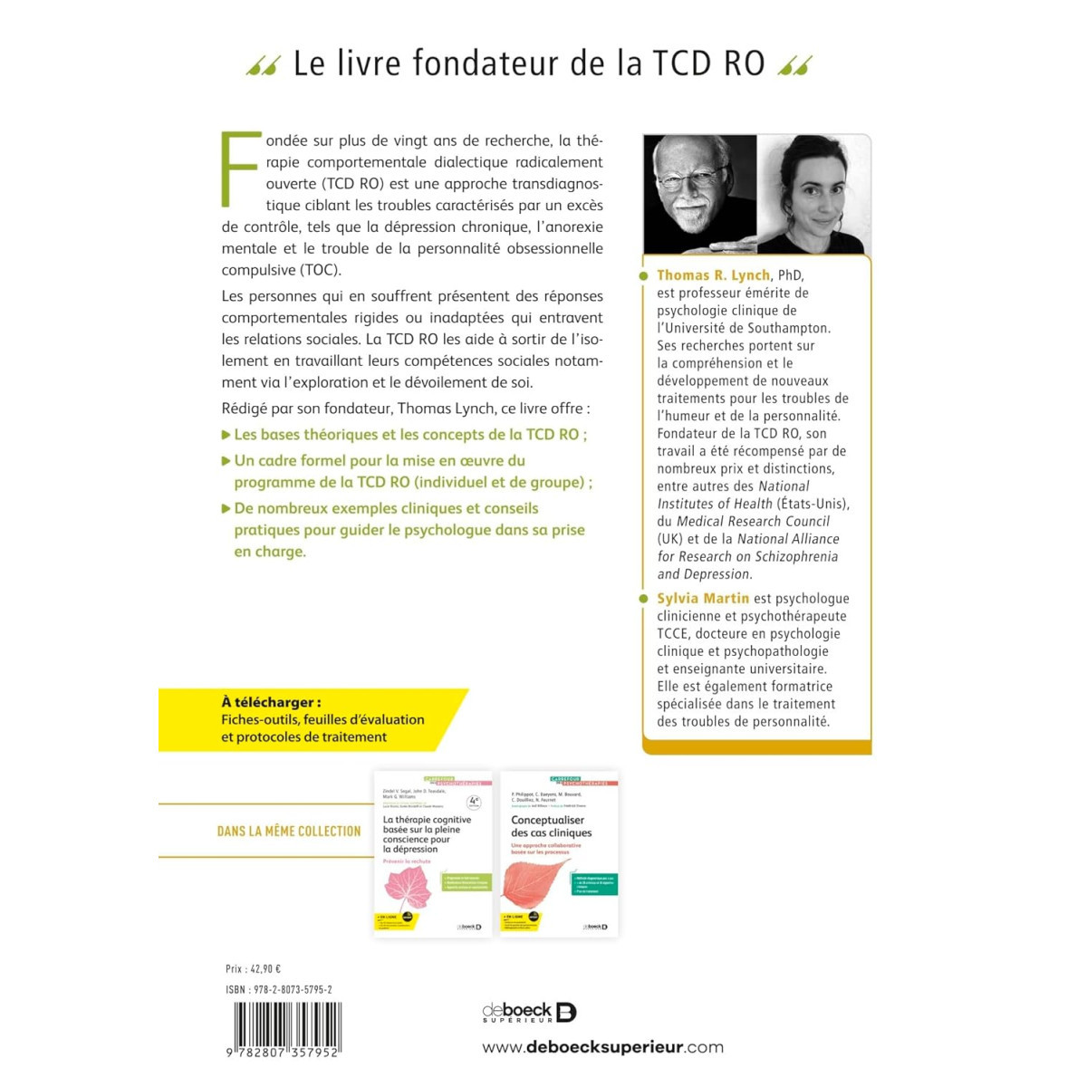 Rédigé par le fondateur de la TCD RO, Thomas Lynch, ce livre complet offre : les théories fondamentales de la TCD RO basées sur le principe que le bien-être psychologique implique la confluence de trois facteurs : la réceptivité, la flexibilité et les liens sociaux ; un cadre pour la mise en œuvre de la TCD RO en thérapie individuelle.