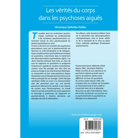 Psychomotricienne diplômée d’état depuis 1981, Véronique Defiolles-Peltier enrichie de son expérience en psychiatrie infanto-juvénile exerce auprès de patients adultes dans différents services de psychiatrie du secteur public depuis 1982. Elle enseigne dans les Instituts de Formation en Psychomotricité à Paris (ISRP et Université Paris VI) et à Marseille. Reconnue au plan international, elle a été invitée à présenter ses travaux sur la psychomotricité en psychiatrie au Mexique et au Danemark.