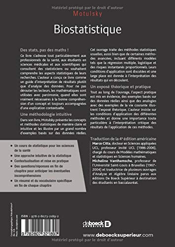 Un texte clair, accessible, qui explique de manière facilement compréhensible les méthodes statistiques et détaille l'interprétation des résultats issus des analyses. Cet ouvrage présente les concepts et méthodes statistiques dans le domaine de la biostatistique. Les concepts fondamentaux sont abordés de façon claire et illustrés par un grand nombre d'exemples basés sur des données réelles. Des analogies avec des exemples de la vie courante permettent aussi de comprendre plus facilement le raisonnement statistique. Les méthodes statistiques usuelles, aussi bien que certaines méthodes avancées, sont abordées. Leurs conditions d'application sont discutées et une large place est donnée à l'interprétation des résultats qui en découlent. C'est un ouvrage vivement recommandé à tous ceux qui, dans le domaine des sciences médicales et biologiques, sont amenés à analyser des données, interpréter des résultats statistiques ou à consulter la littérature scientifique.