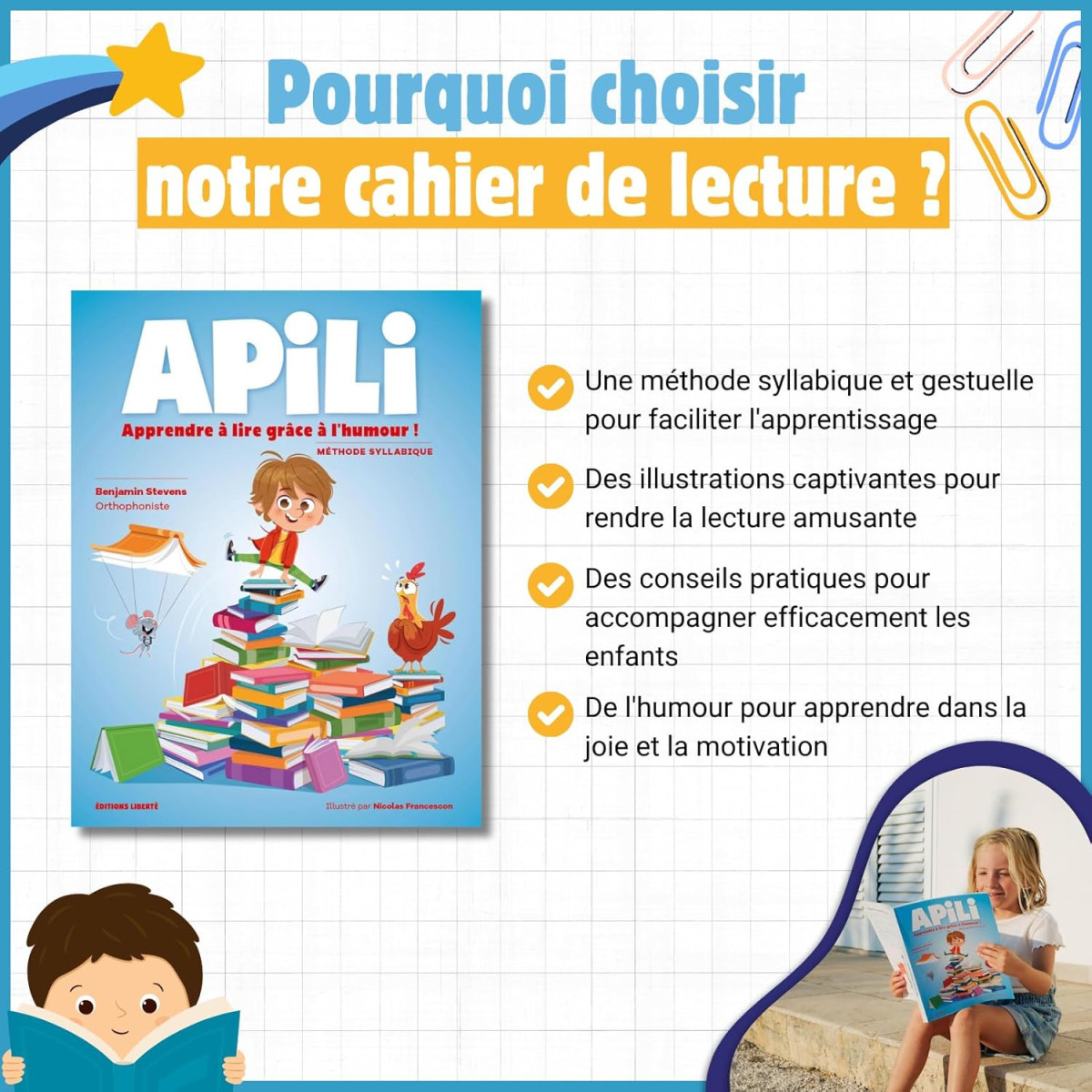 Encouragé par les réactions positives de ses jeunes patients, il a décidé de développer la méthode Apili. Il y associe une méthode syllabique, des illustrations de qualité et de nombreux moyens d'aide. Étudiés par les neurosciences, les bienfaits de l'humour sont nombreux , amélioration du niveau d'attention, de la mémorisation, de la motivation, de la communication et diminution du stress... Autant d'atouts précieux pour aborder la lecture dans les meilleures conditions.