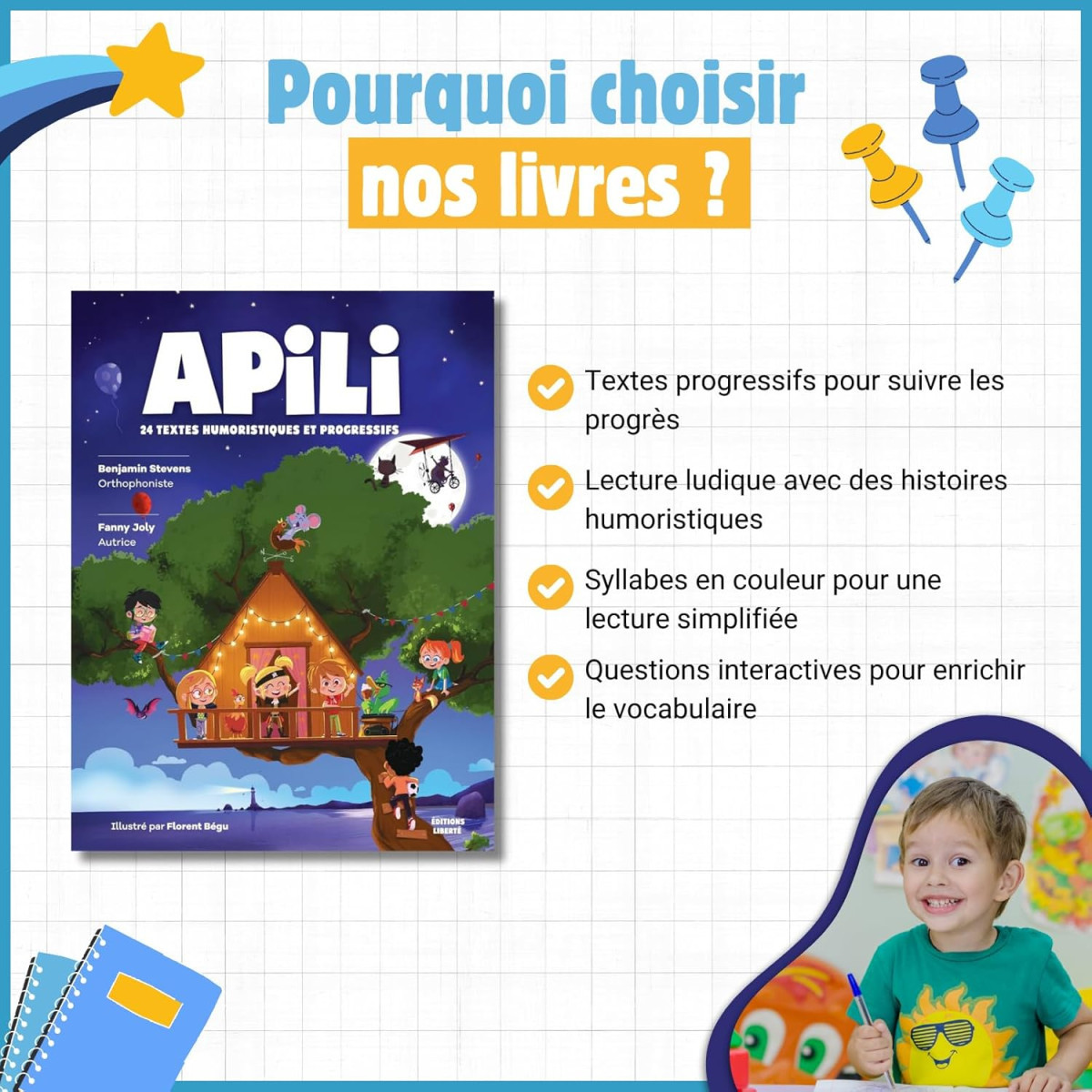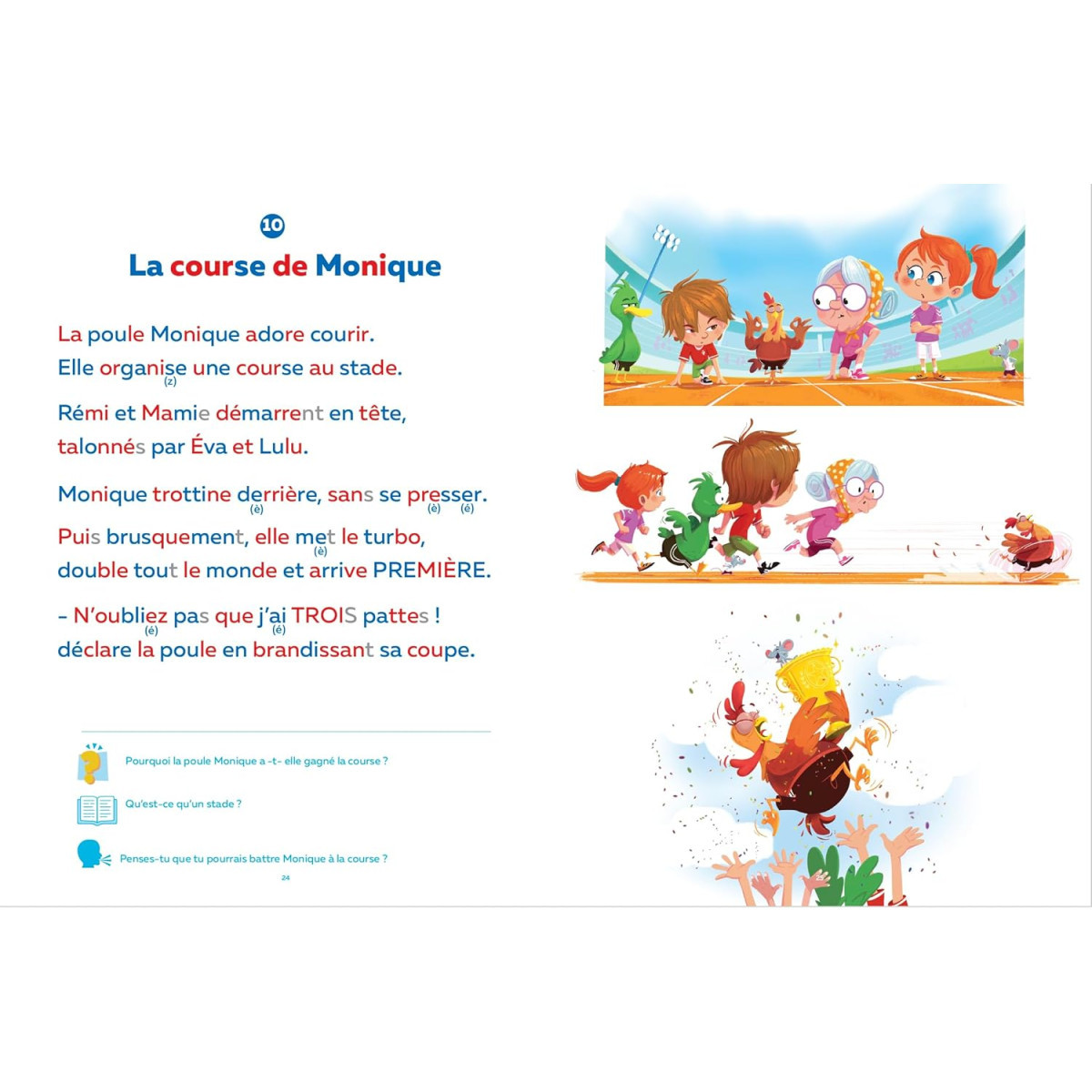 Les textes, composés de 30 à 350 mots, ont été écrits par la talentueuse Fanny Joly. Vous y trouverez des syllabes en couleur et une police de caractère de grande taille adaptée aux jeunes lecteurs. Des questions et notes de vocabulaire ont été ajoutées afin de faire de cet ouvrage un livre utile et motivant. Vous trouverez aussi des questions amusantes à poser à votre enfant afin d’échanger avec lui.